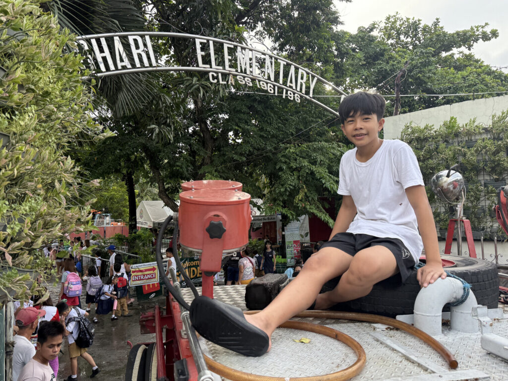 A las 17:00 volví al corazón de Navotas. Cuando estaba pasando por Daanghari Elementary School, ya casi por llegar a la Base, me crucé de casualidad con el escuadrón de Mark en el camión de bomberos. Estaban entrando a la escuela para suministrarles de agua dado que no tenían. Me subí entonces al cambión y entré al colegio con ellos.