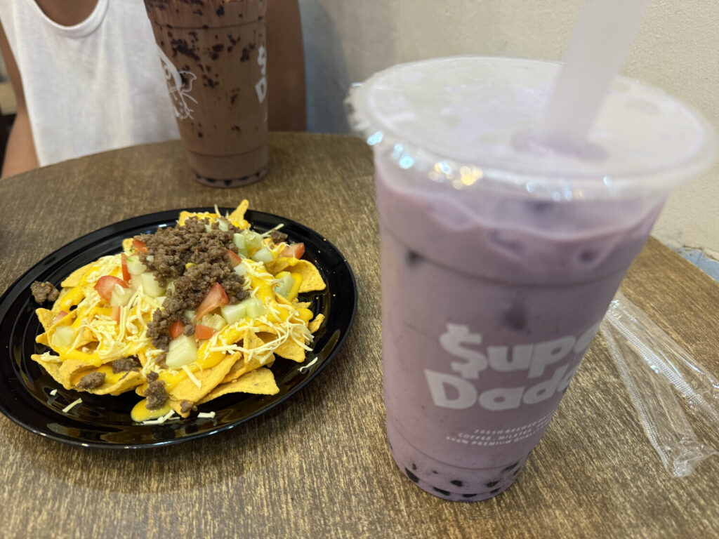 Después de Bacog fuimos a tomar un té frío saborizado a Super Daddy. Khai y Remi se pidieron de chocolate y yo me pedí de ube (un tubérculo). Lo pagué todo yo (₱39 cada uno; ~0,6€). Me podría haber pedido de caramelo salado que es mi favorito, pero para variar un poco y dado que estoy en las Filipinas preferí pedir un sabor específico de este país.