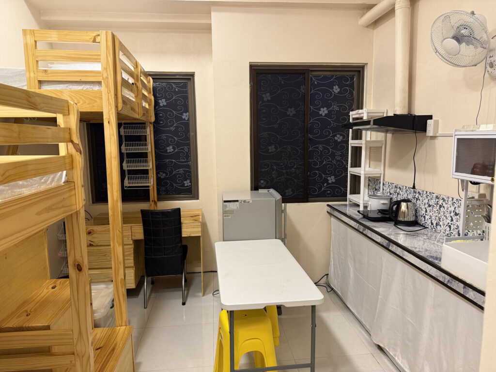 Como ves en la imagen, no es más que un pequeño espacio con unas literas, una mesa, una nevera, un escritorio, una mesada con elementos básicos de cocina, y un baño con ducha e inodoro. Lo más importante para mí era el escritorio, dado que sería el sitio donde realizaría mis exámenes en línea.