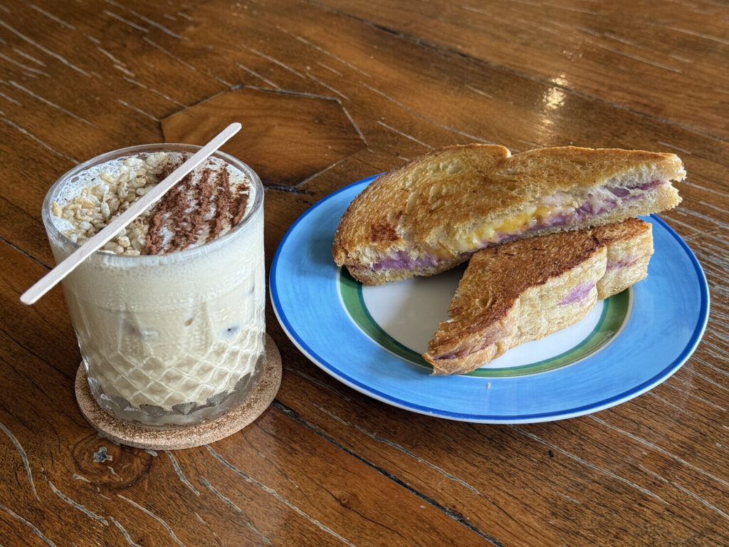 Me pedí un shakerato (café batido y azucarado, lácteos, nata, coronado con pinipig) y ube grilled cheese sandwich (sándwich de mozzarella, cheddar y ube de Baguió). Me costó ₱519 (~8€).