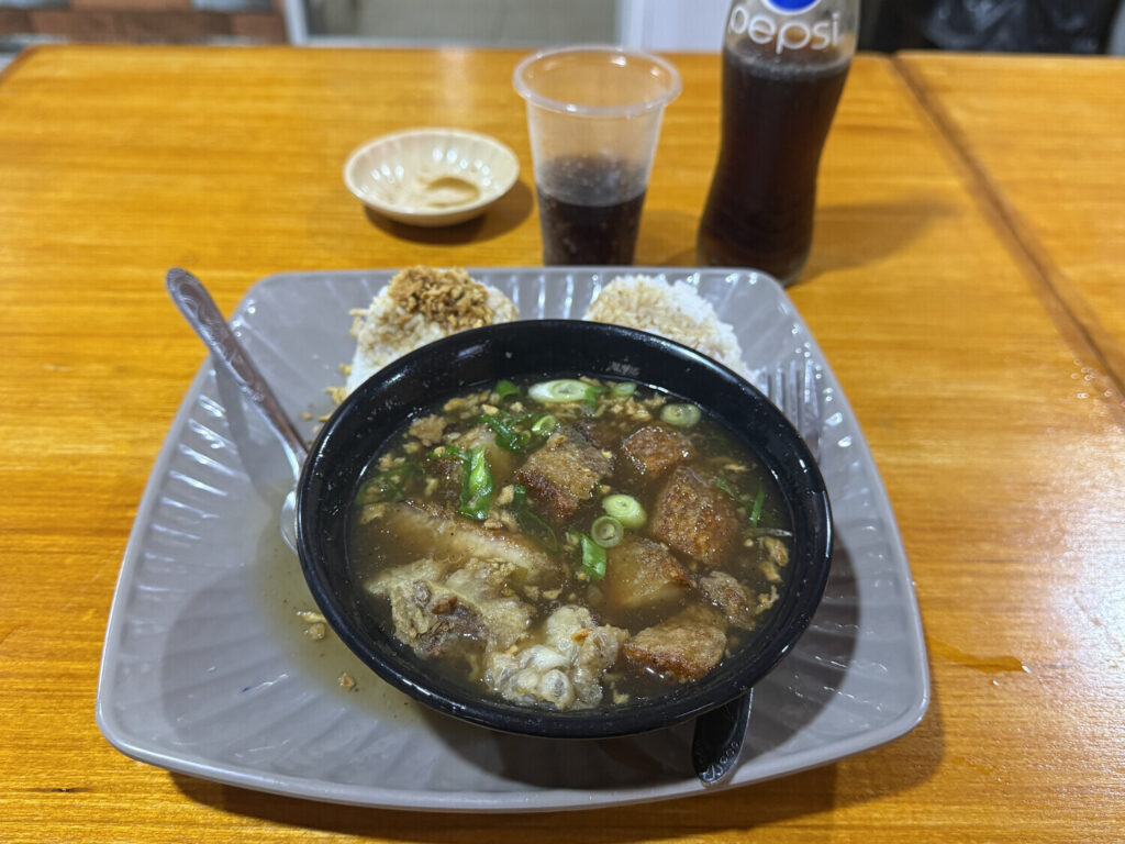 No estuvo nada mal por ₱100 (1,5€). Además incluía arroz y sabaw (caldo de la sopa) ilimitados. También tenían a modo autoservicio guindilla, salsa de soja y patis (salsa de pescado).