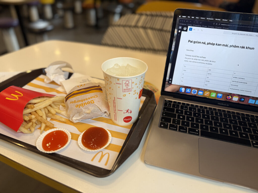 El miércoles tenía que terminar de escribirte lo que había pasado en mis últimos días en Tailandia, así que como no había mucho espacio en mi hotel para estar cómodo escribiendo, decidí ir al McDonald’s que estaba a una cuadra. De paso almorcé ahí (era mediodía).