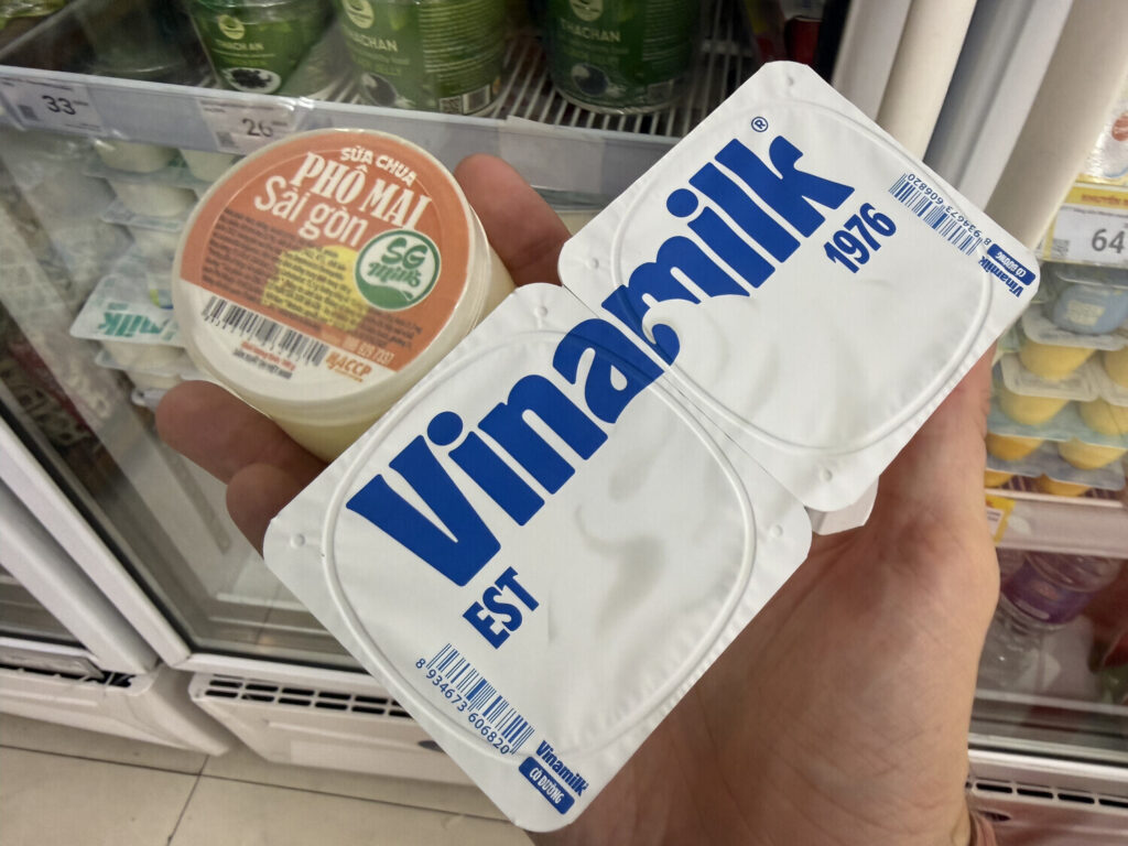 A las 17:00 pasé por un WinMart y me compré un yogur de queso y dos potes de postre de leche Vinamilk. Eso con una botella de agua grande me costó ₫37k (~1,2€).