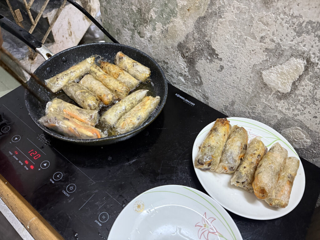 A las 12:00 salí caminando desde mi nuevo hotel hasta la casa de Linh, que me había invitado a almorzar unos nem (rollitos de primavera vietnamitas). En la casa solo estaban Linh y Suong; las demás niñas estaban en la escuela.