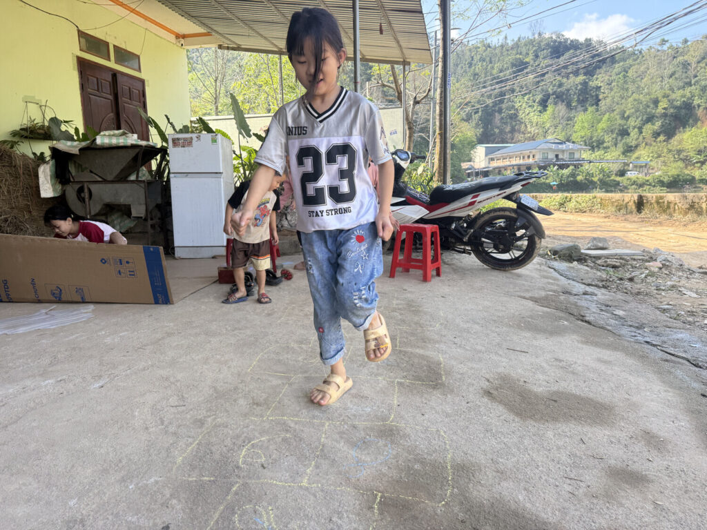 Niñas jugando a la rayuela que dibujé yo en el suelo