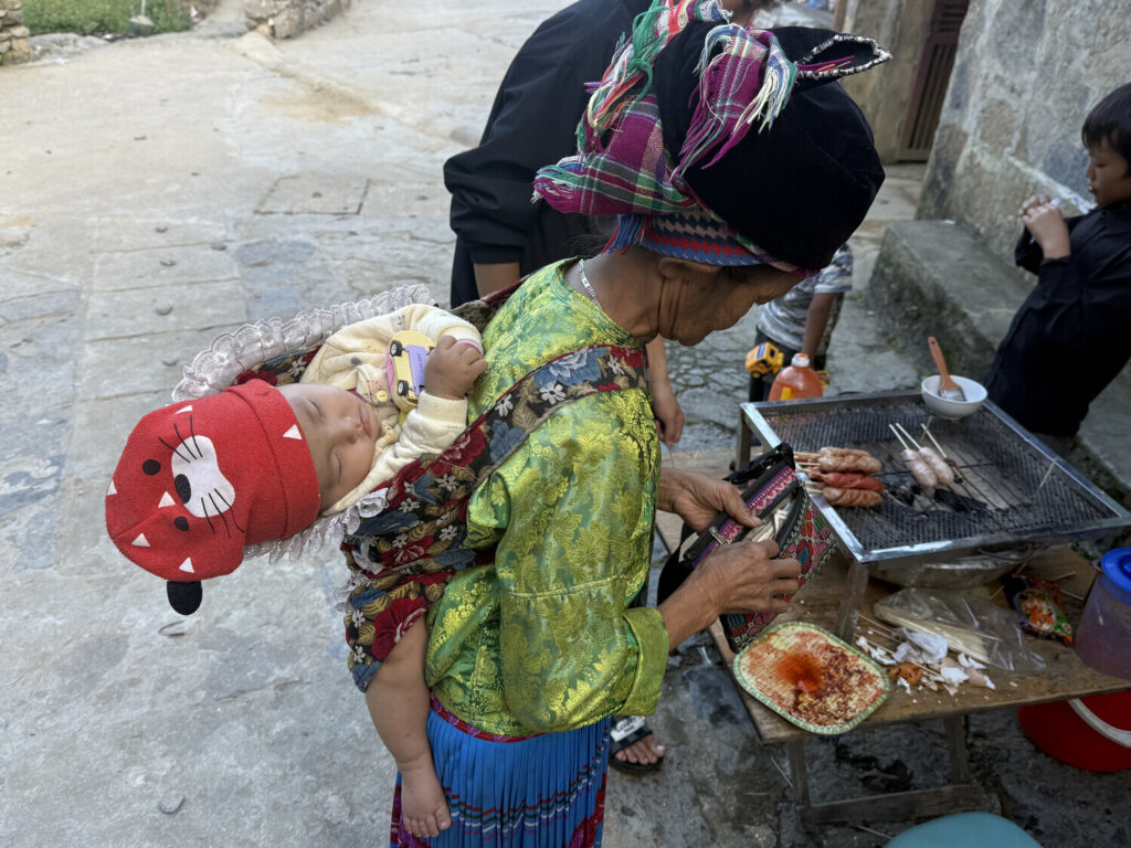 Mujer hmong cargando con un niño en la espalda, una costumbre hmong muy común que he visto ya muchas veces.