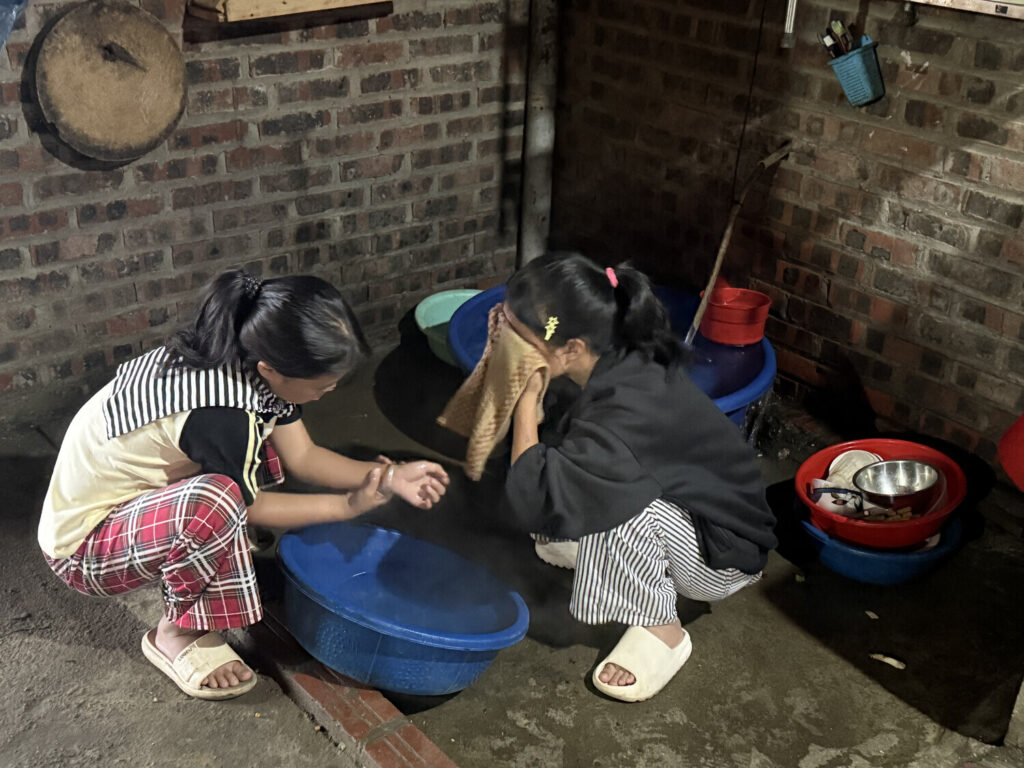 Con esa agua que obtenían de la montaña y con esas cubetas azules de plástico que ves en la foto, lavaban los platos y la ropa. Algunos aldeanos que no tienen ducha también utilizarían estas cubetas para lavar sus cuerpos. Mang tenía duchas en un cuarto afuera, compartido entre su casa y la de sus suegros que quedaba justo al lado.