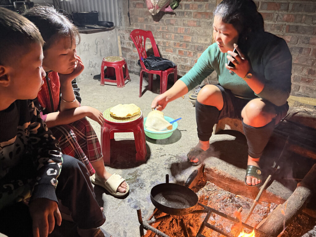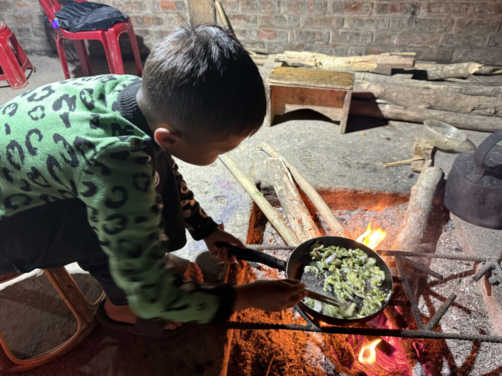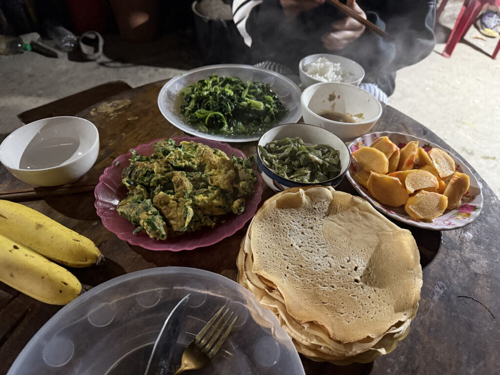 Mang me preguntó que quería desayunar, y yo le respondí que lo mismo que desayunaran ellos normalmente (arroz, frutas y vegetales). Dado que yo era su invitado especial —los hmong son igual de hospitalarios que los vietnamitas—, ella me quería ofrecer algo más rico, así que fue con la moto al supermercado de la aldea a comprar harina para hacer panqueques.