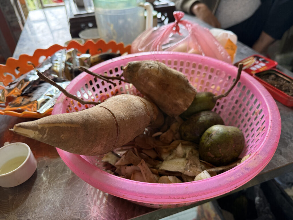 A las 12:30 fuimos a visitar a los vecinos de Peter, quienes me ofrecieron para probar un tubérculo llamado yacón (en vietnamita: sâm khoai). También me dieron un poco de té—cada vez que entras en la casa de un vietnamita, el anfitrión lo primero que te va a ofrecer siempre es una taza de té.