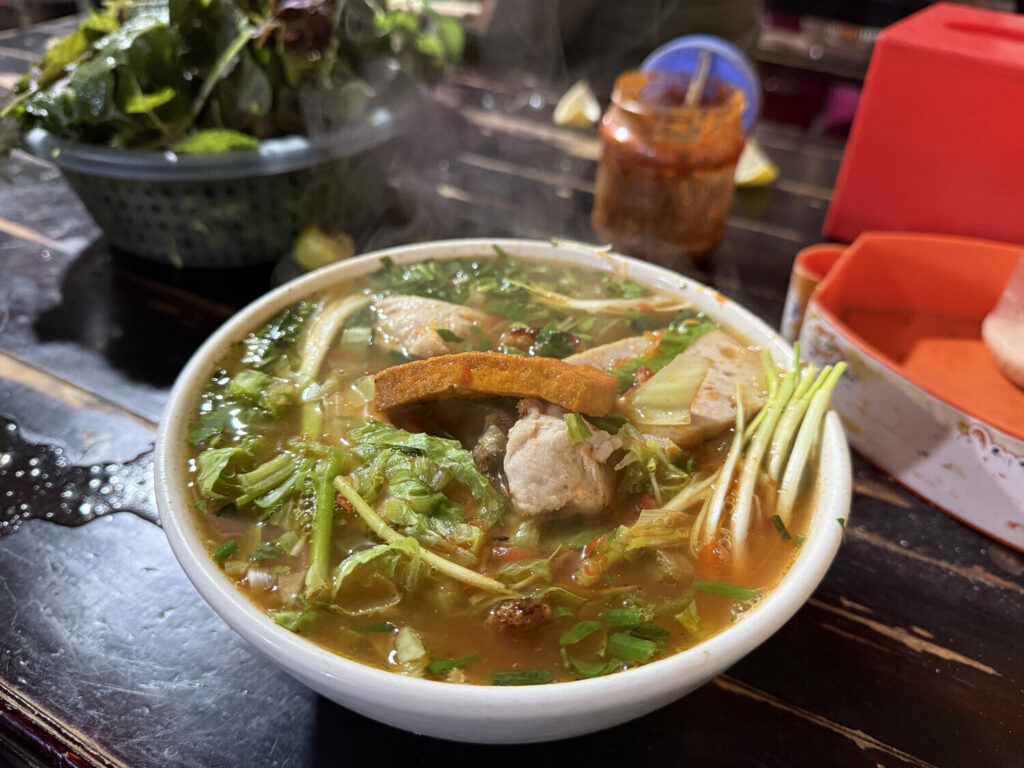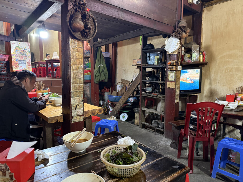 A las 13:30 volvimos al pueblo para almorzar. Peter me llevó a uno de sus restoranes más frecuentados, llamado Quán Bún chả Nga Cảnh. Pidió dos boles de bún chả, uno para mí y uno para él. Invitó él.