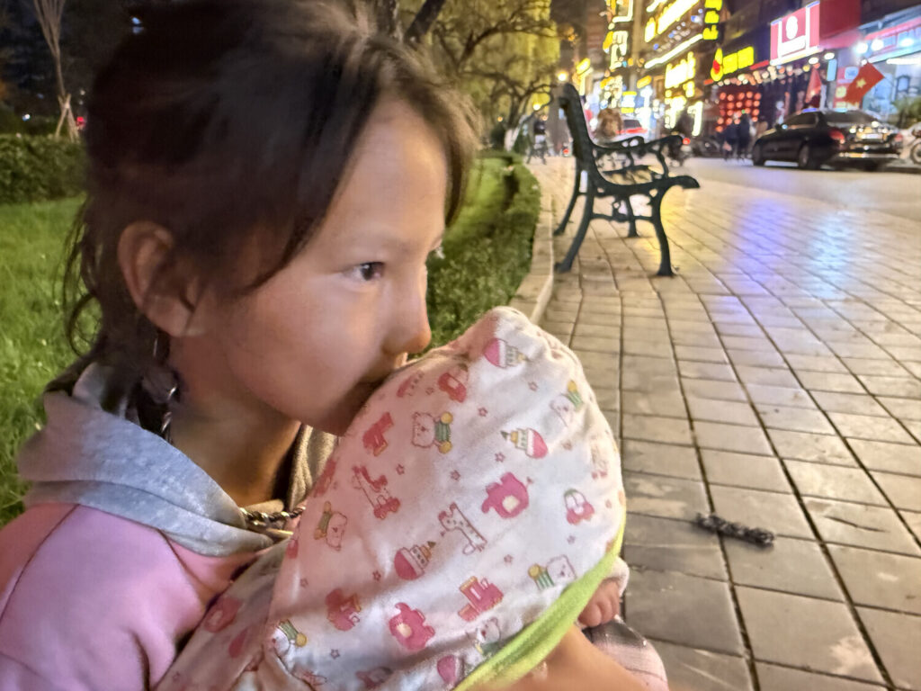 Esta niña estaba sentada en la acera con su hermano bebé encima de ella