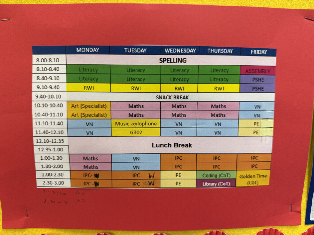 Si no me equivoco esta aula era de primer grado (G1). Una de las pistas de esto es que tenían una materia llamada alfabetización (Literacy), y otra que tenía que ver con un programa de lectoescritura (RWI). Curiosamente también tenían programación (Coding):