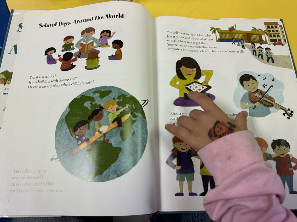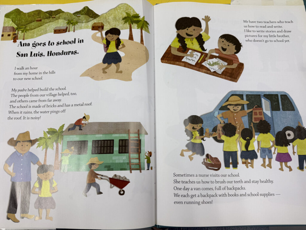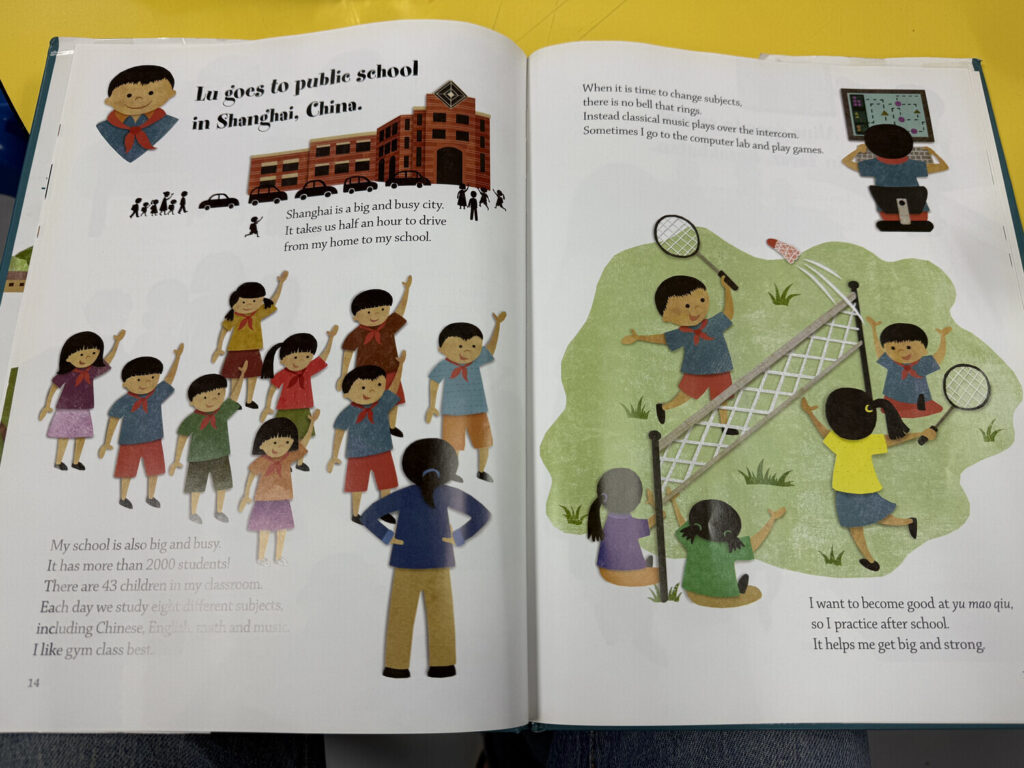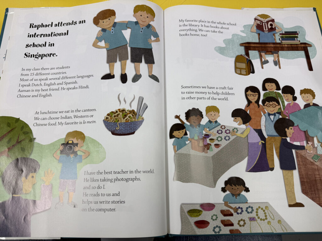 Me empecé a aburrir de la sesión de preguntas y respuestas así que me puse a ver los libros que tenían en la biblioteca. En eso me encontré con uno que me pareció interesante, titulado School Days Around the World (Días de escuela alrededor del mundo).