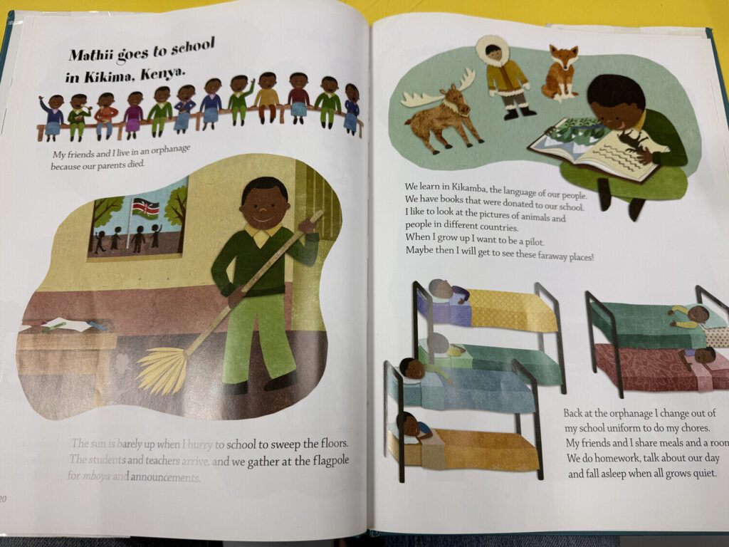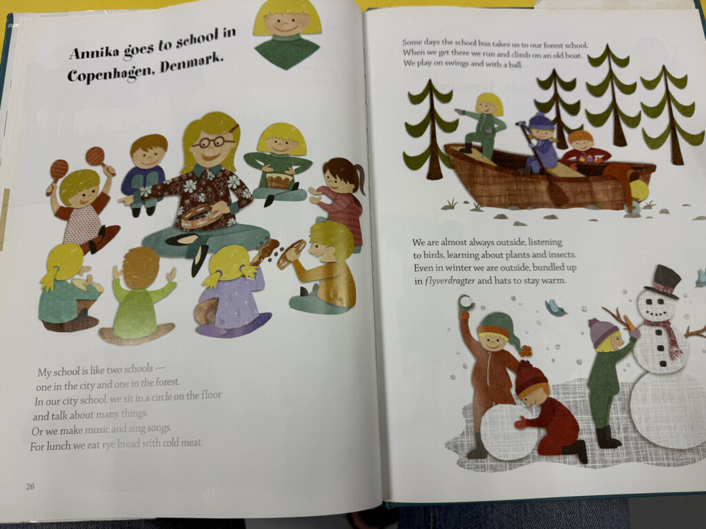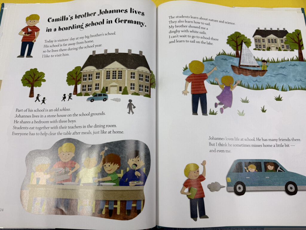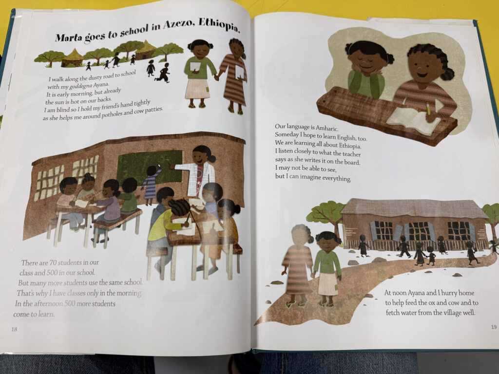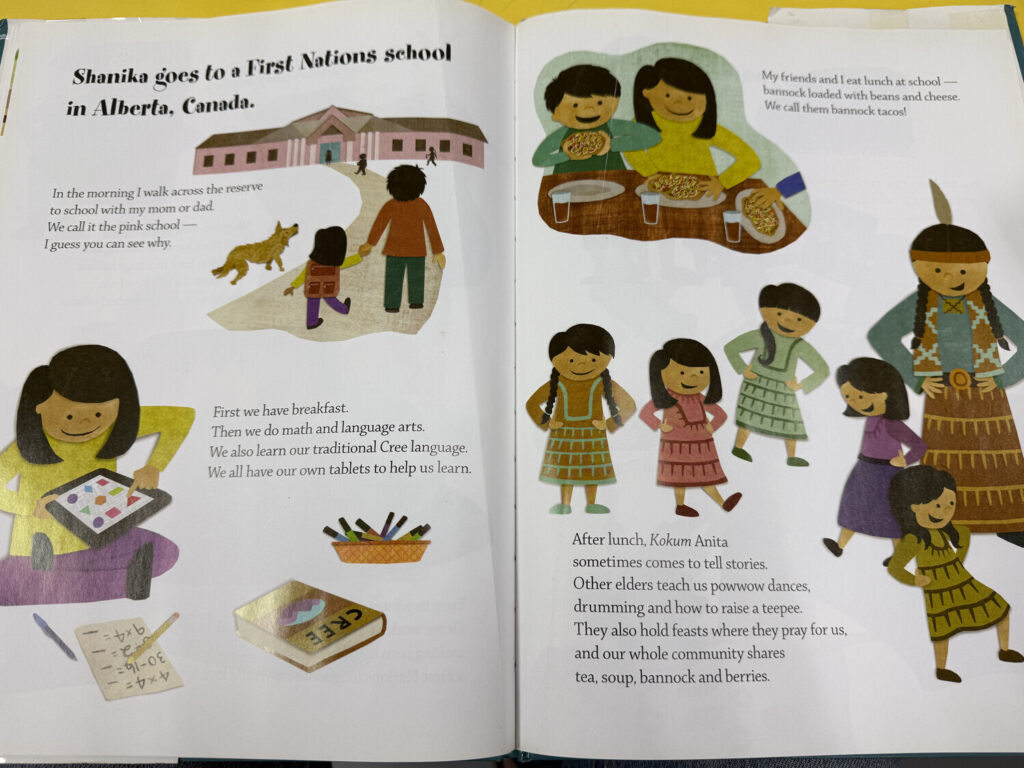 Me empecé a aburrir de la sesión de preguntas y respuestas así que me puse a ver los libros que tenían en la biblioteca. En eso me encontré con uno que me pareció interesante, titulado School Days Around the World (Días de escuela alrededor del mundo).