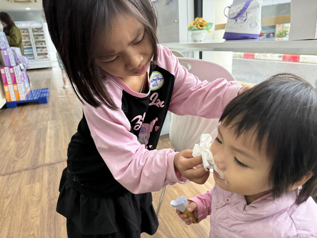 Mientras Linh y yo estábamos escuchando la charla y haciendo el tour por la escuela, Suong estaba en otra aula con los demás hijos de los participantes del evento, jugando, dibujando, etc.