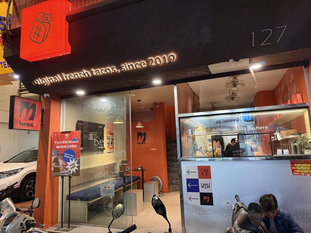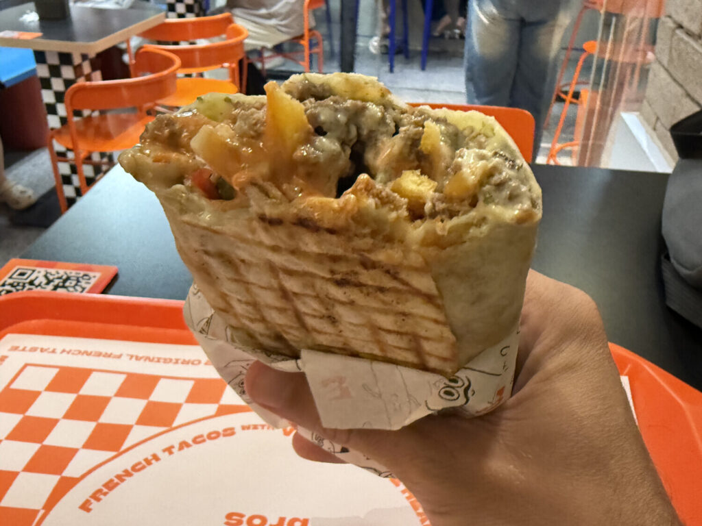 Fui a un local llamado M’Bros, que vendía tacos al estilo francés (de esos que vienen con un montón de cosas adentro, incluyendo patatas fritas).