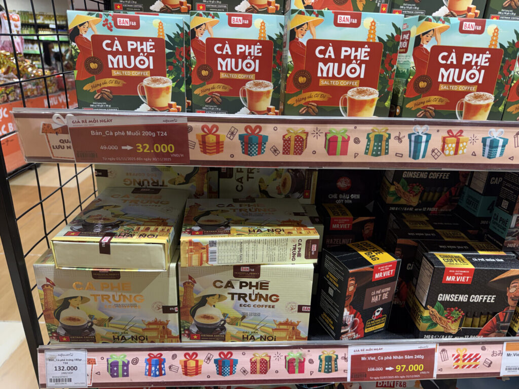 Tenían café instantáneo de huevo y salado. El de huevo costaba mucho más así que me compré una caja del salado, que encima estaba en promoción (₫32k; ~1€).