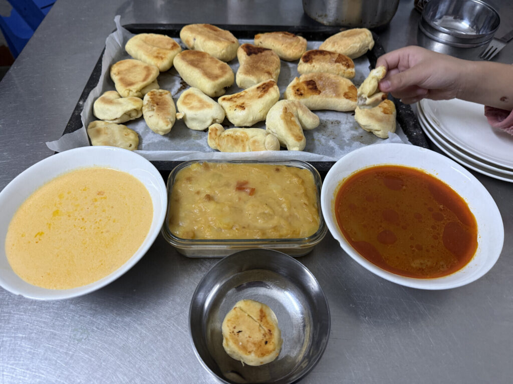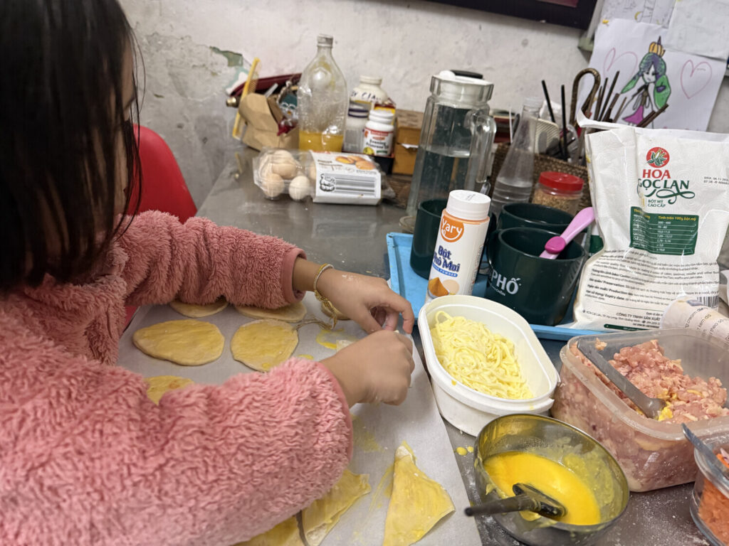 A las 11:00 llegué y me puse a ayudar a cocinar. Hicimos empanadas con Suong, mientras Linh las ponía en el horno y preparaba también platos secundarios como arroz.