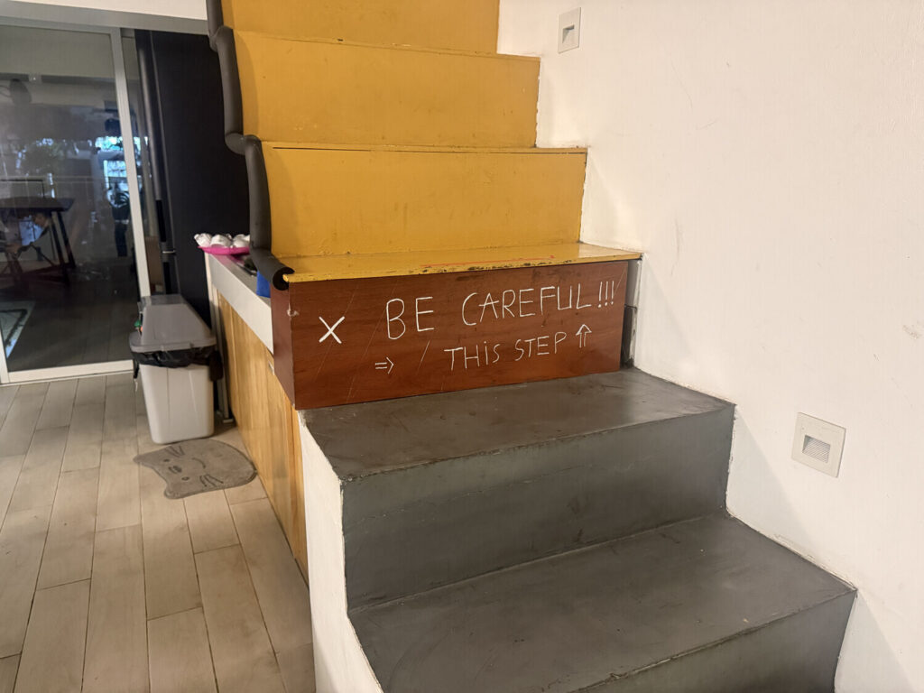 En mi hotel hay un escalón que es unos centímetros un poco más alto que los escalones anteriores, lo cual hace que mucha gente se tropiece con él.