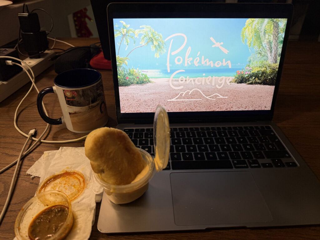 A las 22:00 me puse a ver un capítulo de Pokémon Concierge —primera vez que veía animé en mucho tiempo— mientras cenaba unas empanadas que me dio Linh.