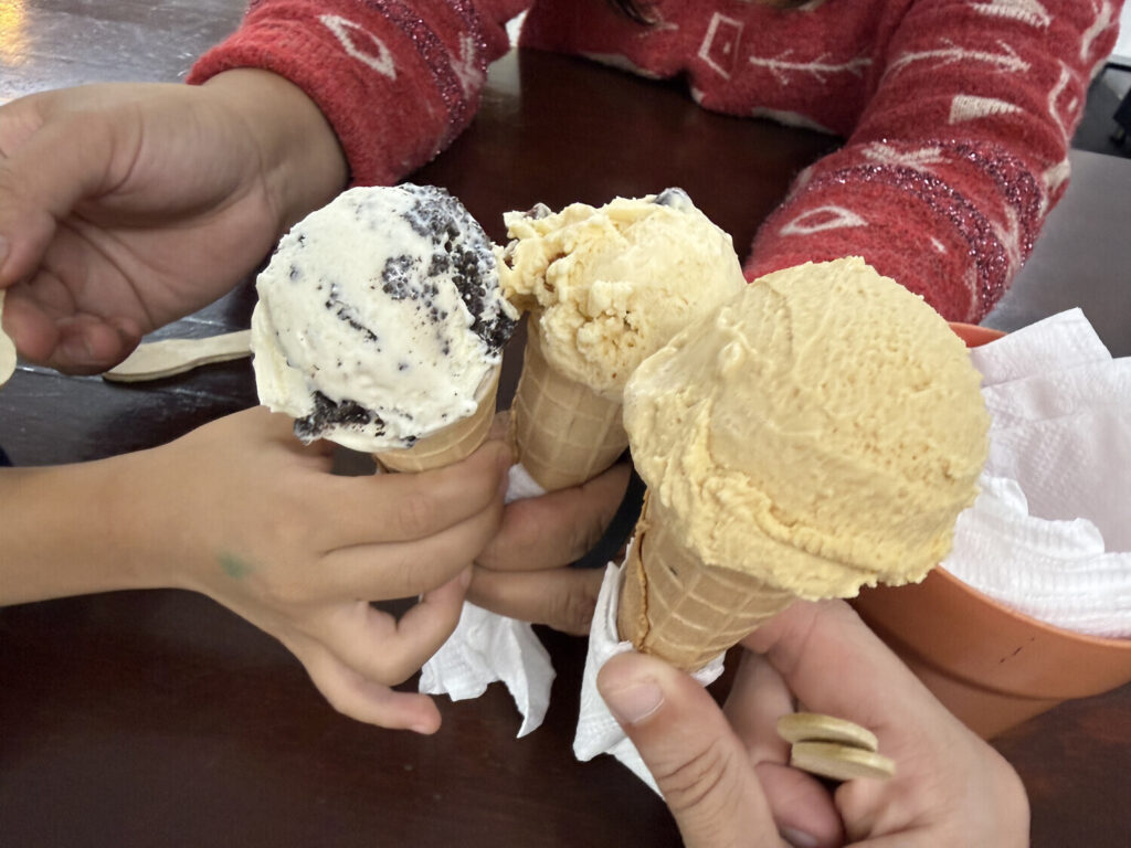 Pedimos tres conos (uno para cada uno), los cuales costaban ₫50k (~1,6€) cada uno. Suong se pidió sabor Oreo, Linh sabor ron con pasas, y yo sabor caramelo salado.