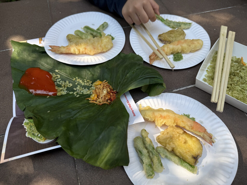 Me contó Linh que solo los puestos que tenían detrás a las embajadas más ricas ofrecían cosas gratis. Argentina no ofrecía nada gratis, pero Japón por ejemplo sí, así que nos pasamos al puesto de Japón y esperamos un rato mientras preparaban unos platos de tempura que estaban regalando. Nos dieron tres platos (uno para mí, uno para Linh y uno para Suong).