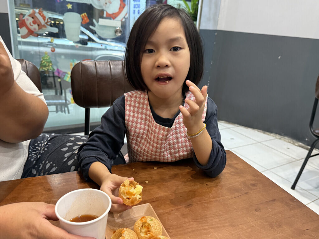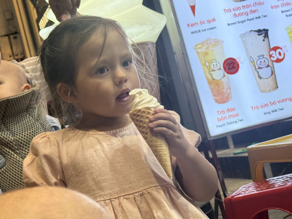 A las 21:00 nos pasamos a un Mixue para tomar el postre (kem; helado). Allí nos encontramos con una loli de tres años que era mitad sueca mitad vietnamita.
