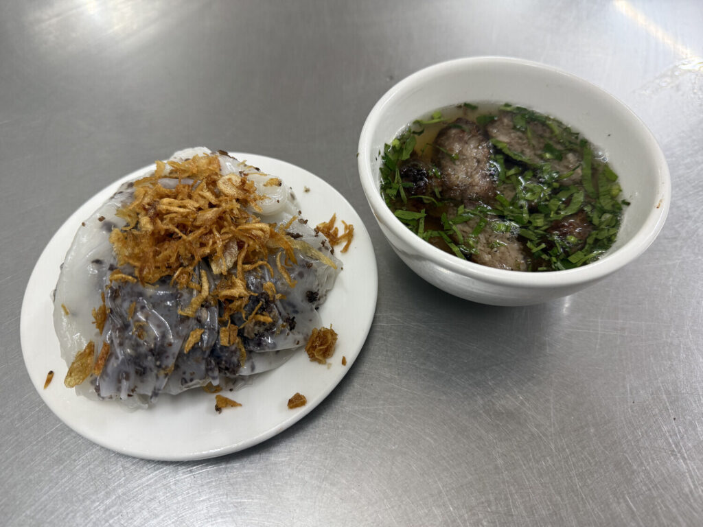 No había mucha gente ni coches en la calle; tampoco había muchos lugares abiertos ni muchos sitios para comer, aunque por suerte solo tuve que caminar por un par de minutos hasta dar con uno. Me pedí bánh cuốn (₫30k; ~1€).