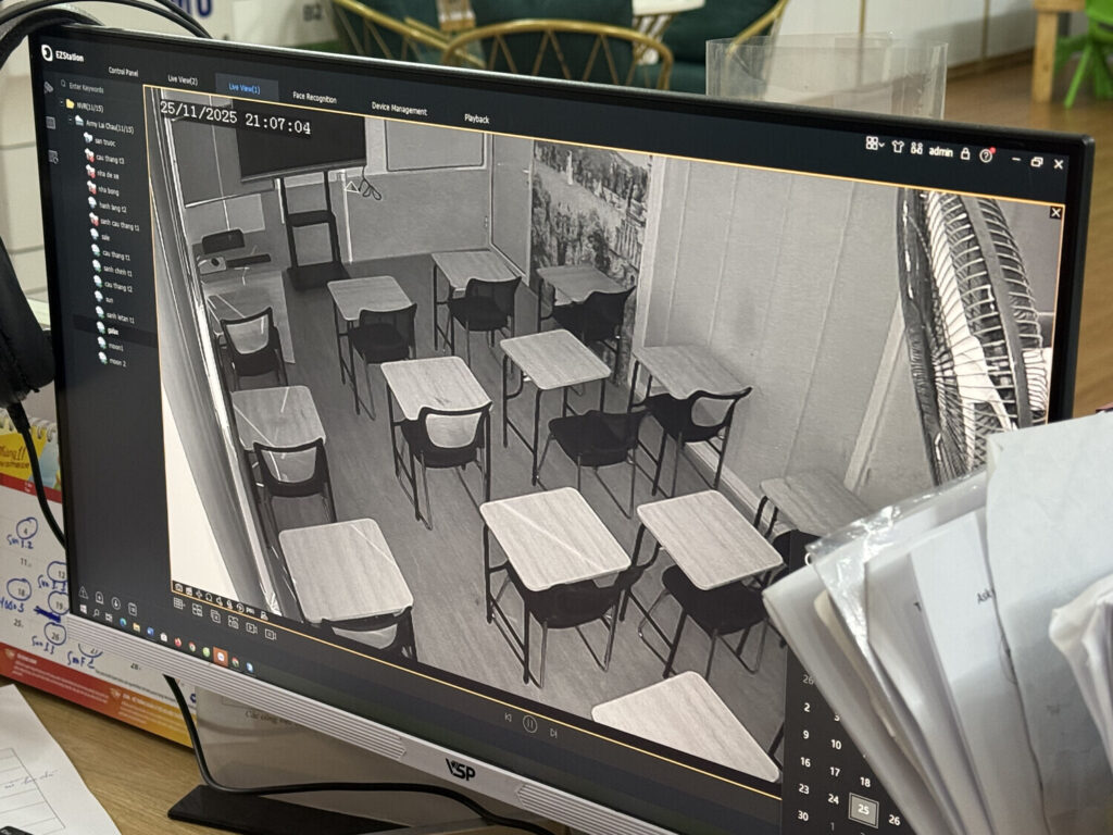 En general no me gusta que haya cámaras en las aulas donde enseño dado que me hace sentir como si hubiese una persona sentada en el fondo del aula observando mi clase constantemente y juzgando todo lo que hago. Pero es cierto que a veces pueden venir bien, por ejemplo gracias a la cámara una mujer del personal se enteró de que los niños de Sun S me estaban dando problemas al estar descontrolados y entonces subió a ayudarme a reestablecer el orden para poder seguir con el libro.