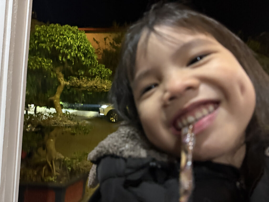 A las 21:30, cuando volví al hotel me crucé con una loli de 4 años que resultó ser la hija de los dueños. Le di un snack y jugué un rato con ella. La cargué en brazos, la hice girar para todos lados y la hice reír. Luego sus padres me invitaron a sentarme con ellos al lado del fuego que tenían encendido. También estaba la hermana mayor, que tenía 10 años. La de 10 estaba en TikTok; la de 4 estaba sentada en mi regazo jugando conmigo.