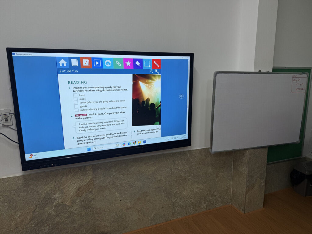 Cuando llegué al aula me puse a preparar todo antes de que llegaran los alumnos, lo cual consistía básicamente en encender el televisor-ordenador, abrir la aplicación del libro correspondiente al curso, e ir a la página que tocaba estudiar hoy.