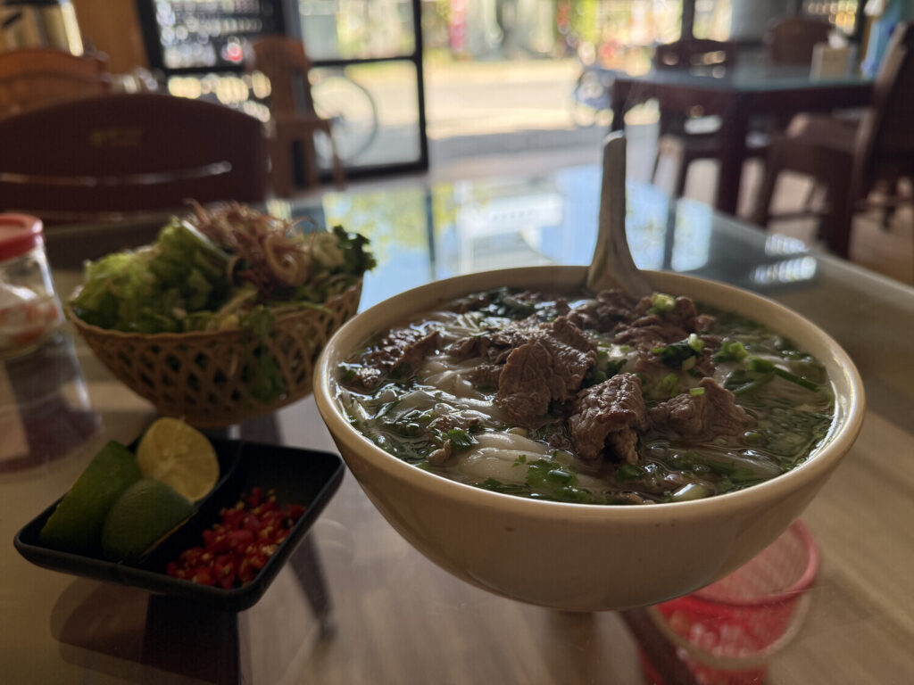 Salí a las 10:00 y caminé durante media hora hasta dar con una tienda de phở. Me pedí un phở bò por ₫40k (~1,3€), el cual considerando la hora que era y lo mucho que me habían servido me funcionó como desayuno y almuerzo a la vez. Dos por uno.