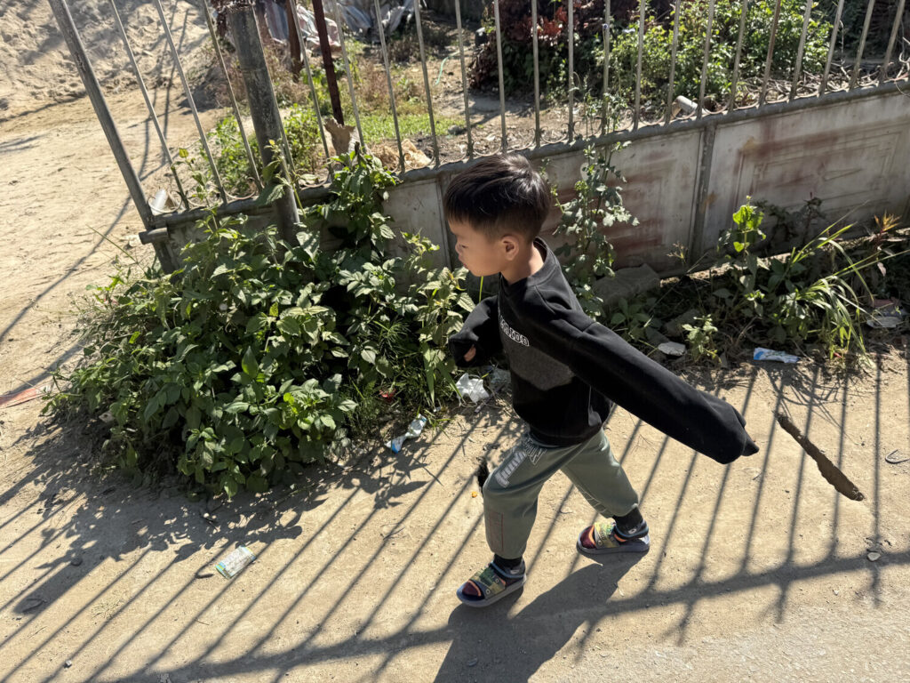 Cerca de las 13:00 me crucé con un niño pequeño que estaba solo caminando por al lado de la carretera, intentando llegar a un lugar como yo. Como los dos estábamos solos y los dos teníamos que ir en la misma dirección, nos hicimos compañía mutuamente caminando uno al lado del otro. A pesar de que no intercambiamos ninguna palabra (debido a la barrera del idioma), se sintió bien haber podido compartir esos minutos en silencio que pasé caminando junto a este niño desconocido.