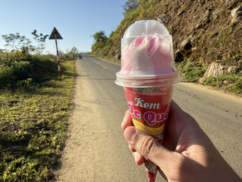 A las 15:30 me topé con otros dos niños varones que estaban solos en la carretera. Cuando me vieron me sonrieron, me saludaron y se me acercaron. Cuando estuvieron lo suficientemente cerca noté que estaban cargando con una bolsa llena de helados tipo cono de los que se compran en supermercados. Sin decirme absolutamente nada (solo sonriéndome), uno de los niños cogió uno de los helados y me lo ofreció. Yo lo tomé, le agradecí y continué mi camino.