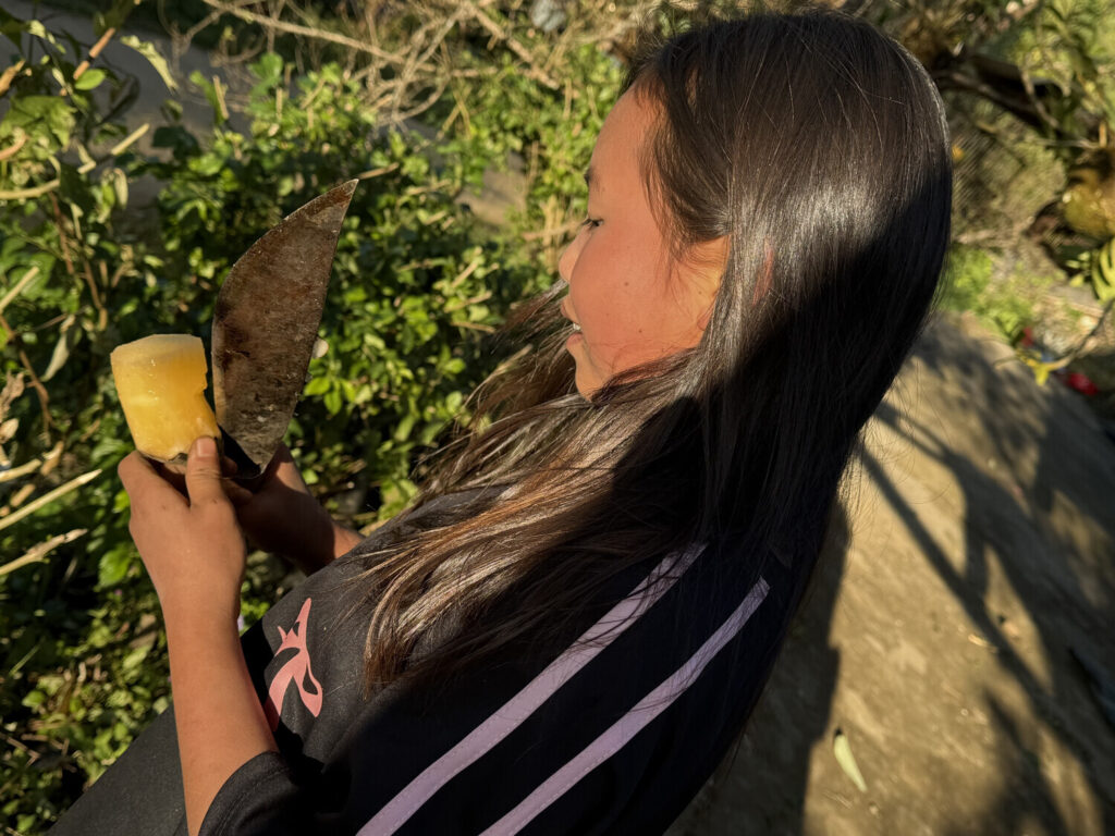 Tan pronto como entré en la aldea me encontré con lo que no me había encontrado durante todo el trayecto a pie: niñas. Literalmente la primera casa que vi tras pasar la entrada tenía dos lolis afuera, que cuando me vieron se metieron tímidamente para adentro. Las saludé y me acerqué con cautela para no espantarlas (las niñas tímidas son como los pájaros; si vas demasiado rápido se van volando). Una de ellas tenía una machete en la mano y estaba cortando una fruta.