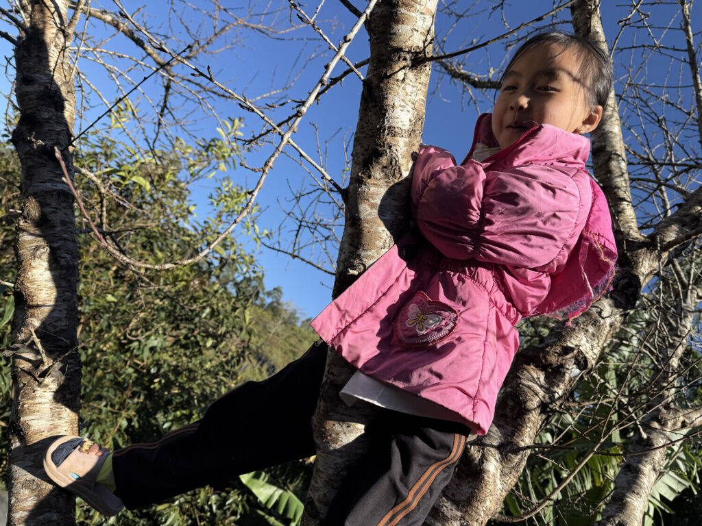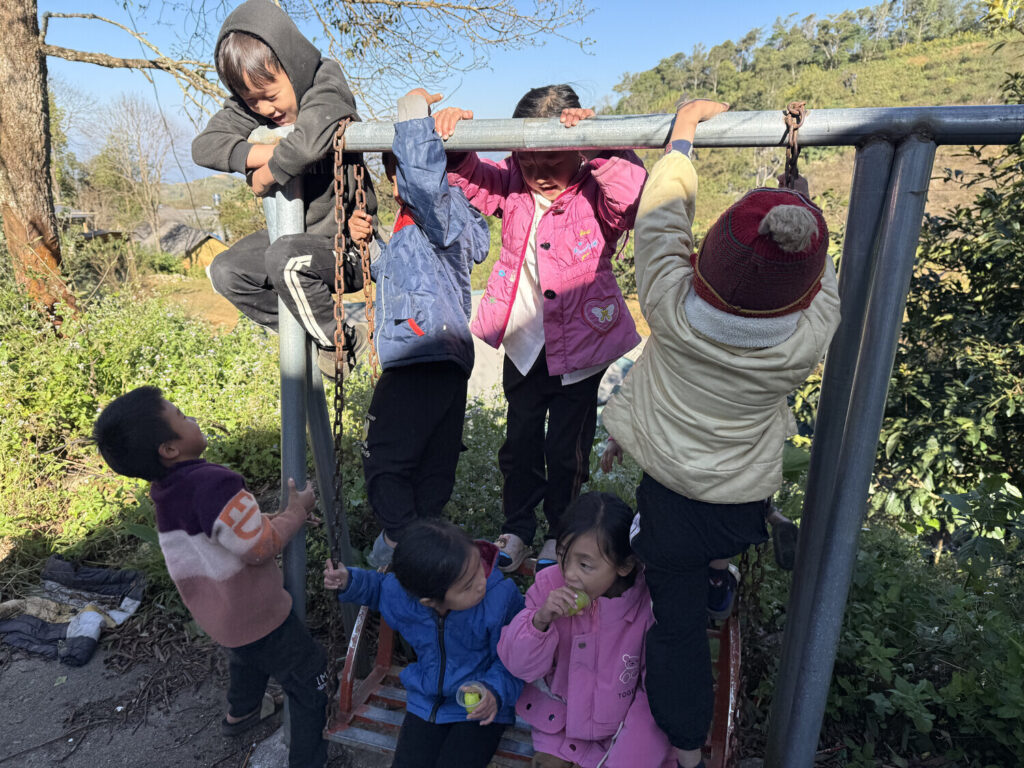 Cuando llegamos de vuelta a la aldea nos sentamos un rato en los columpios. Fue en ese momento cuando de repente apareció la abuela —o al menos pienso que era la abuela— de Neng para llevársela a su casa, probablemente porque era la hora del almuerzo y seguramente después la siesta (aunque según me dijo uno de los niños, por lo general no duermen siesta aquí sino que se la pasan jugando afuera).