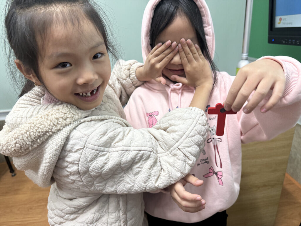 Una niña cubriéndole los ojos mientras la otra intentaba adivinar lo que tenía en la mano (letra T).