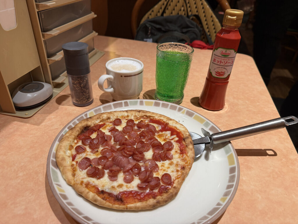 Me pedí una pizza con drink bar, y un par de horas más tarde me pedí unos espaguetis; básicamente lo que siempre suelo pedir cada vez que vengo aquí. Me costó exactamente 1000 yenes (~5,5€).