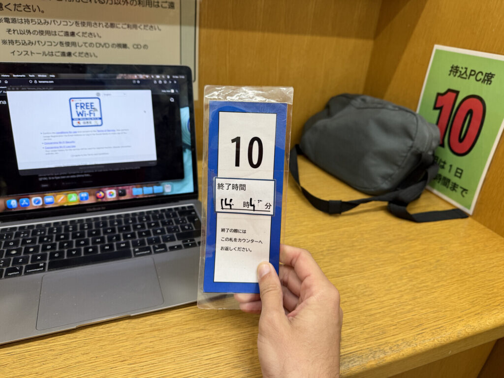 Me acerqué a la recepcionista para preguntarle dónde podía ir a sentarme y utilizar mi propio ordenador, tras lo cual me dio un formulario donde tuve que escribir mi nombre y número de teléfono, y luego me entregó una tarjeta con un número 10 y un texto que decía que me podía quedar hasta las 14:40 (tres horas en total). Me acompañó hasta el espacio número 10, donde me pude sentar y utilizar mi laptop.