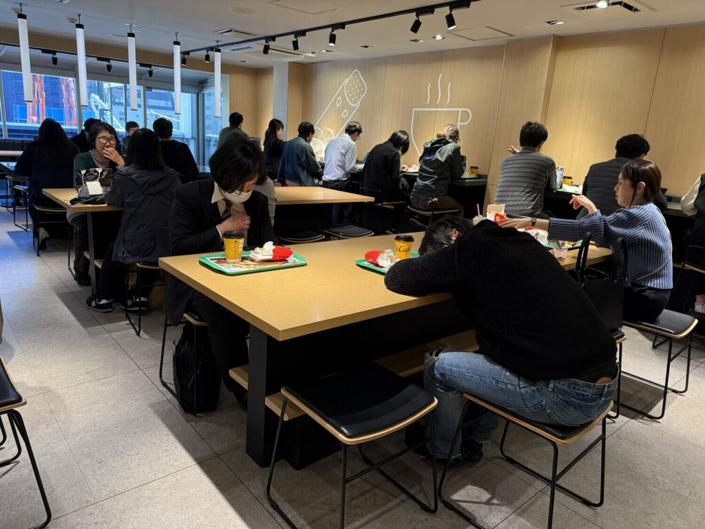 Si bien era gratis, había que pedir obligatoriamente al menos una bebida. Me pedí un caramel macchiato (¥800; ~4€). Me senté primero en una mesa de inglés y luego probé con una de japonés.