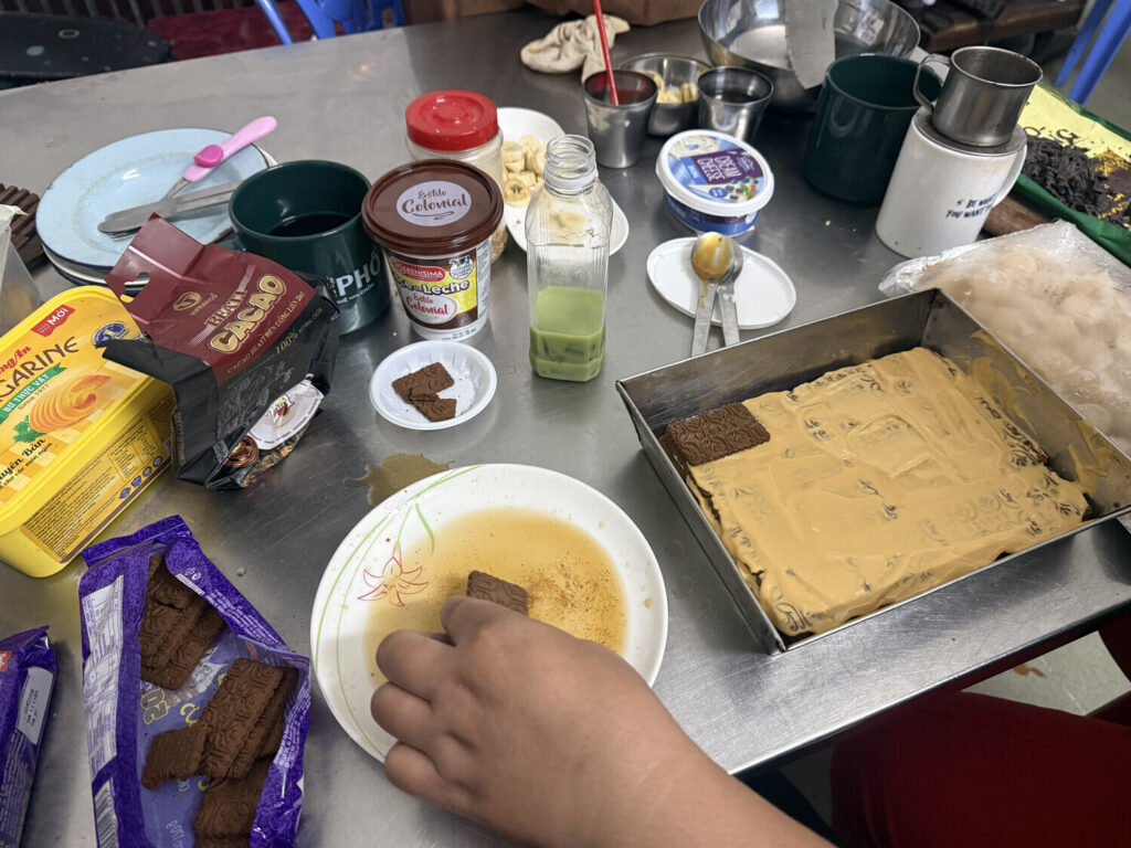 Como te imaginarás, la idea con el DDL y las Chocolinas era hacer una Chocotorta. Así que salí al supermercado a comprar queso crema y nata montada (₫332k; ~11€—caro porque ambos eran importados), y nos pusimos manos a la obra.