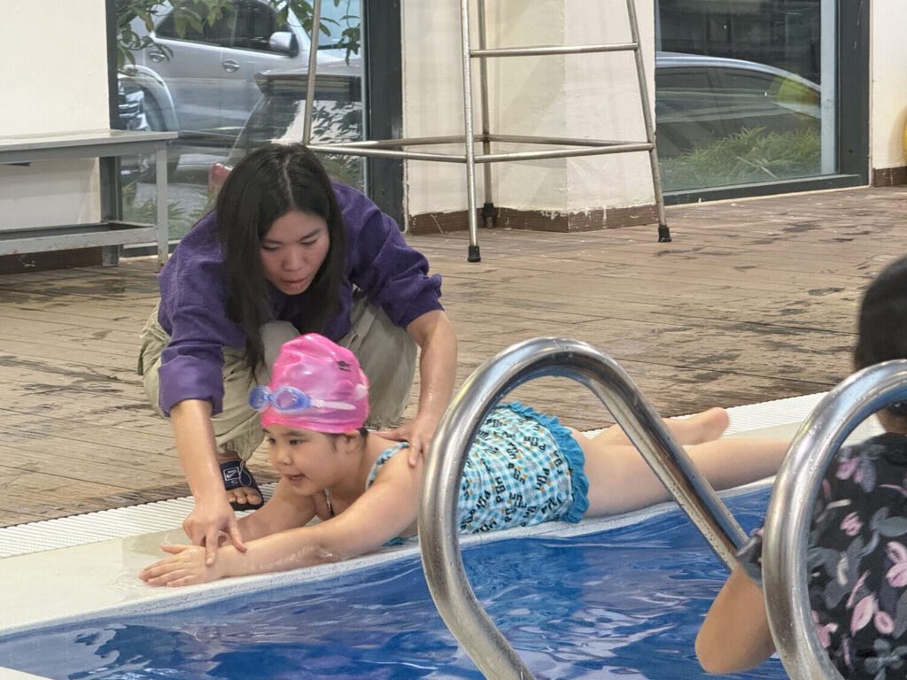 Había una profesora de natación vietnamita dando clases a algunos niños. Me sorprendió la forma en que daba la clase: ella estaba afuera de la piscina, vestida sin traje de baño sino con ropa normal, mientras que los niños estaban dentro o a veces también afuera.