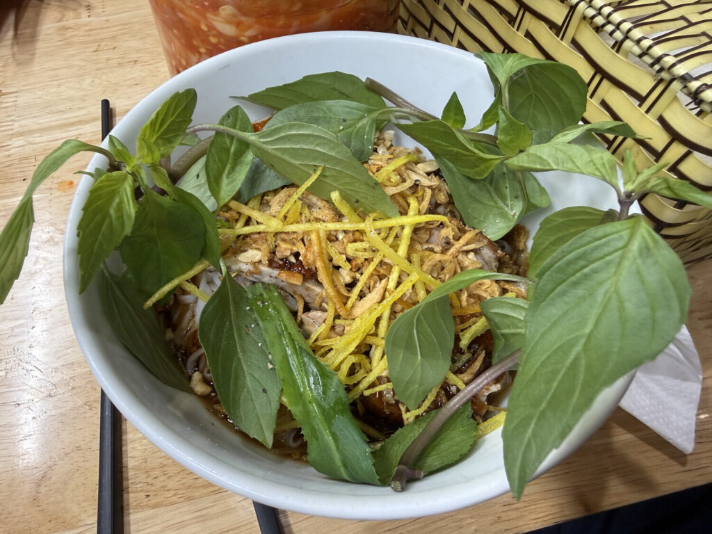 Linh me dejó en la piscina con Suong mientras se fue a buscar a Diễm a la escuela y a traerla a la piscina. Luego cuando salimos nos fuimos todos a comer un phở chua (phở agrio). Invitó Linh.