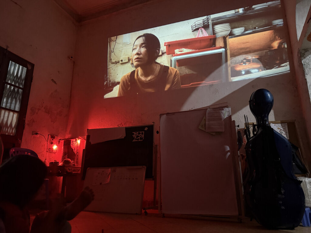 Cuando terminamos de cenar nos pusimos a ver la peli en el proyector. Nos acostamos en el piso, sobre unos colchones y peluches que Linh había traído. Éramos Linh, Diễm, Suong, yo y las palomitas que preparó Linh. Phuc no quiso participar de la noche de cine (así como no participa nunca de casi nada con su familia, por eso nunca aparece en mis entradas).
