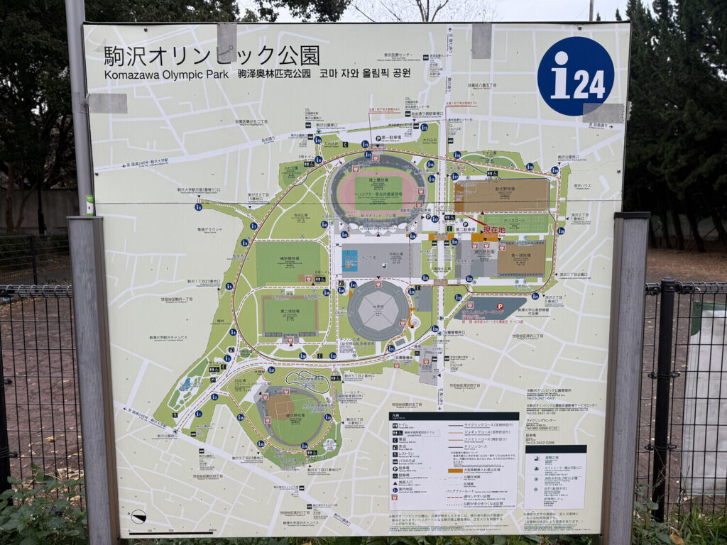 Cerca de las 16:00 llegué a 駒沢オリンピック公園 (Komazawa Olympic Park; Parque olímpico de Komazawa). No era la primera vez que visitaba un parque olímpico japonés. Se trata de un enorme parque donde hay un montón de facilidades de recreación y deportivas. Por ejemplo, leyendo el mapa veo que este en partícular tenía un estadio de atletismo, un gimnasio, pistas de tenis, un campo de béisbol y uno de sóftbol, varios espacios para jugar a la pelota, varios parques infantiles, y un parque para perros.