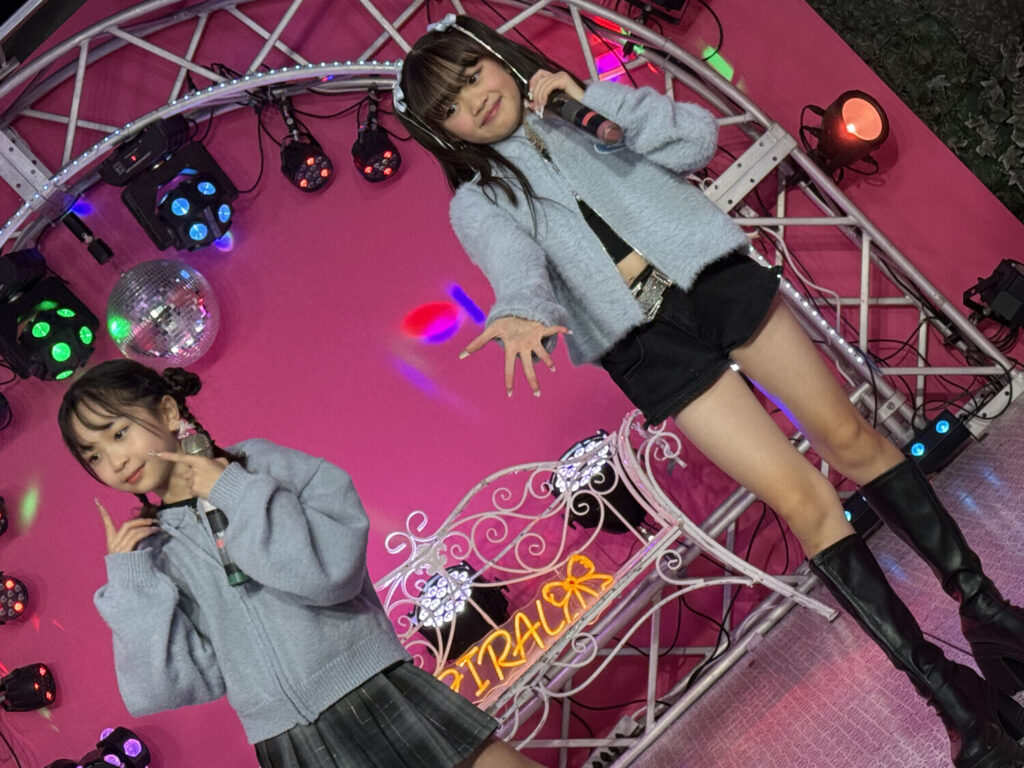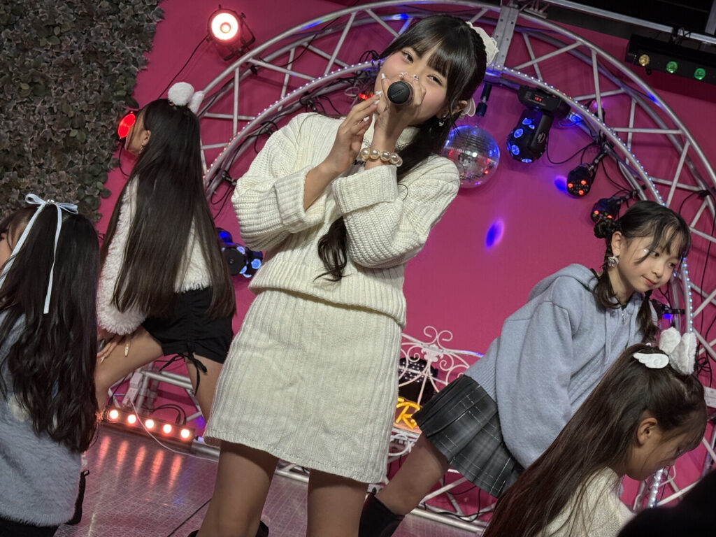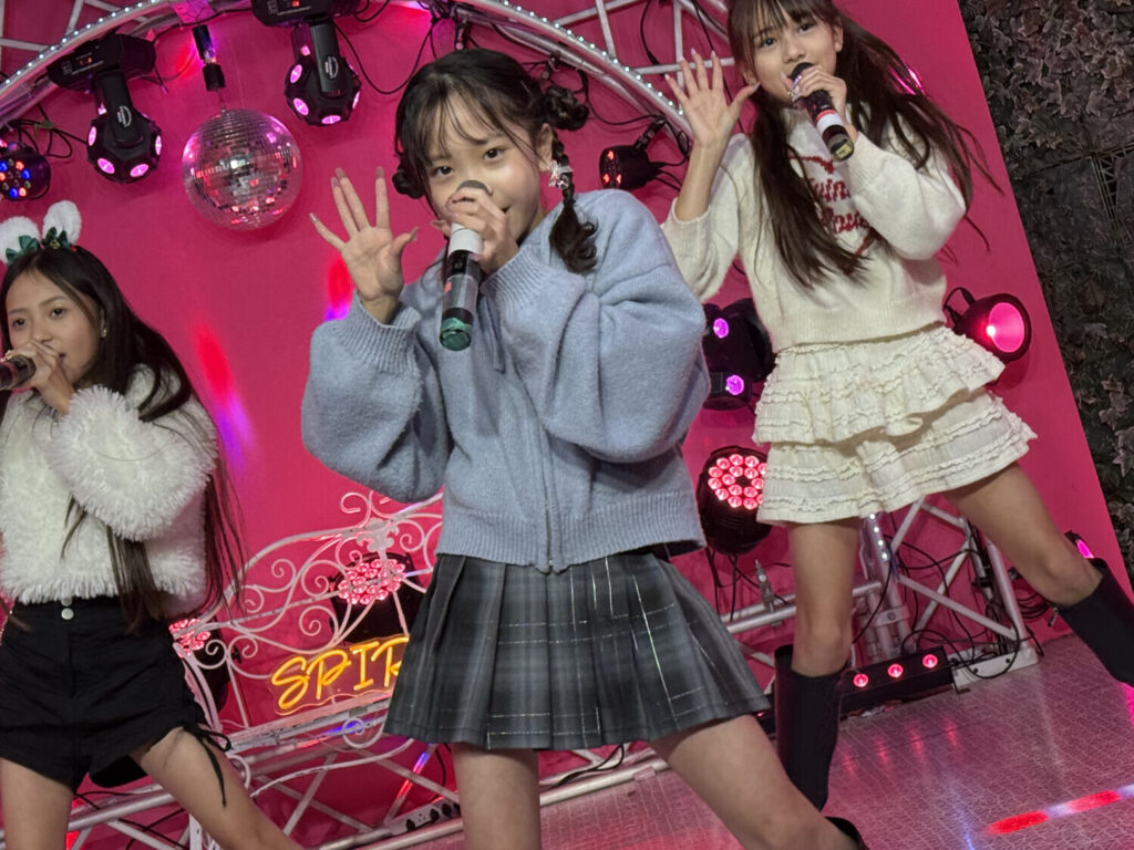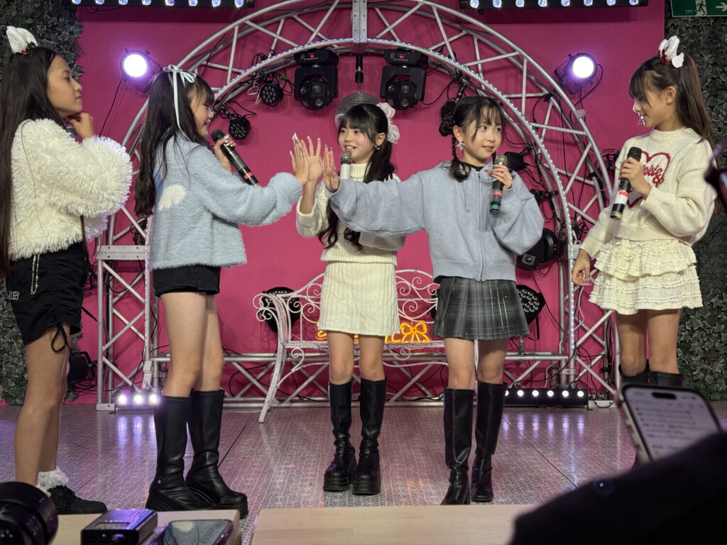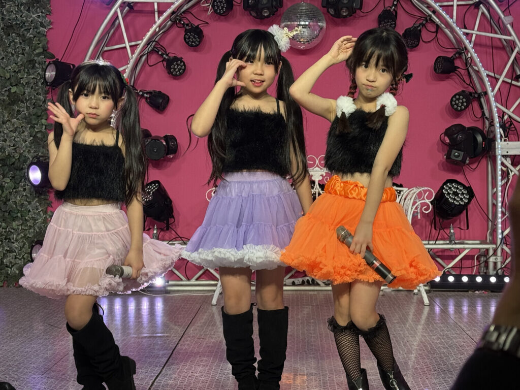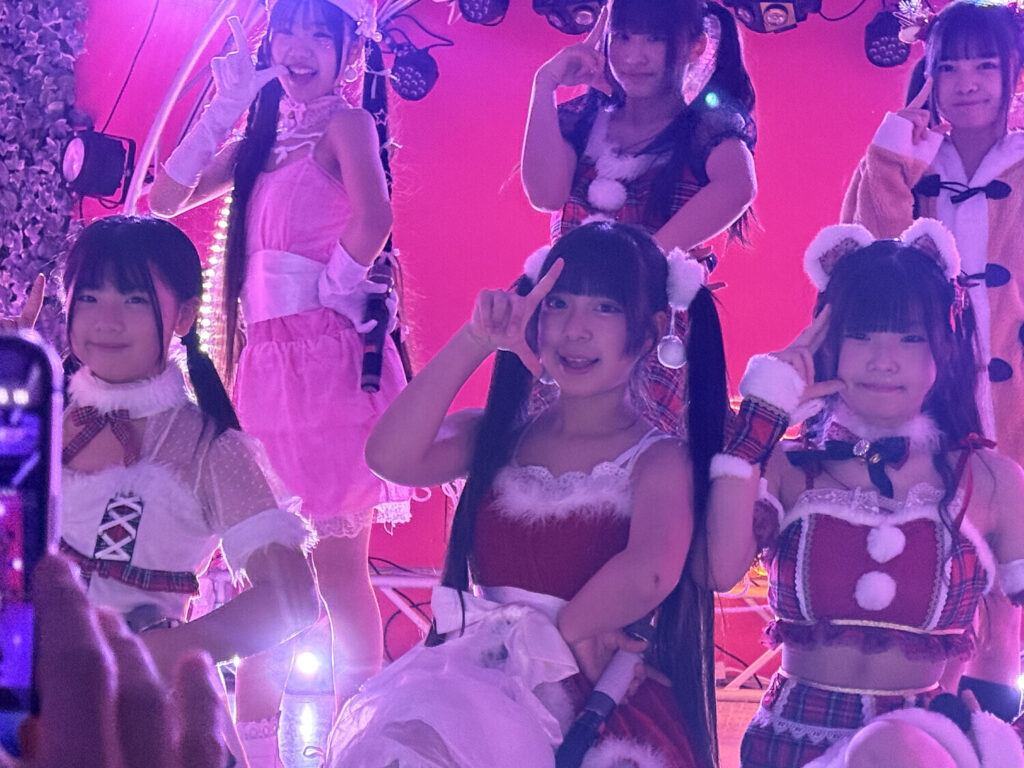 El primer grupo en pasar fue ねこたいがー (Neko Tiger), compuesto por cuatro niñas de entre 5 y 9 años, aunque parece que una de ellas estuvo ausente este día. Mi 推し (oshi; miembro favorito en un grupo de idols) era Yumena-chan.