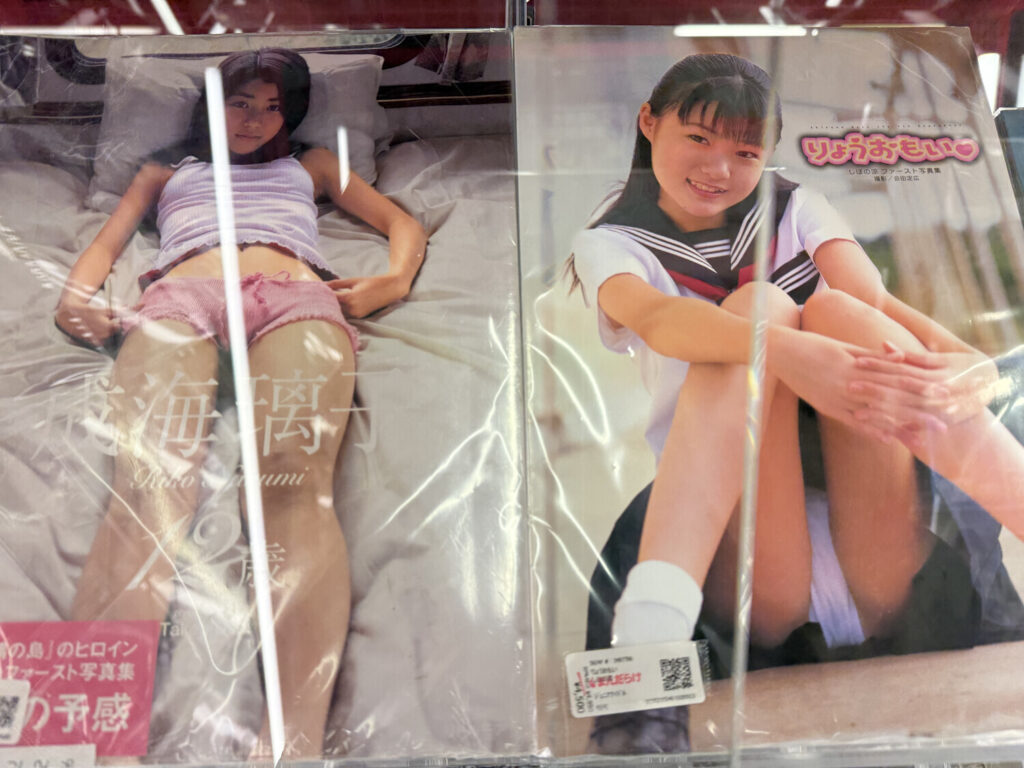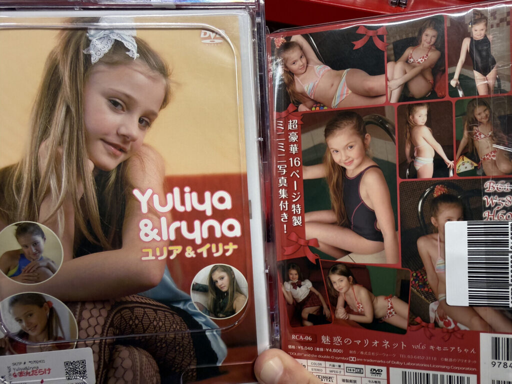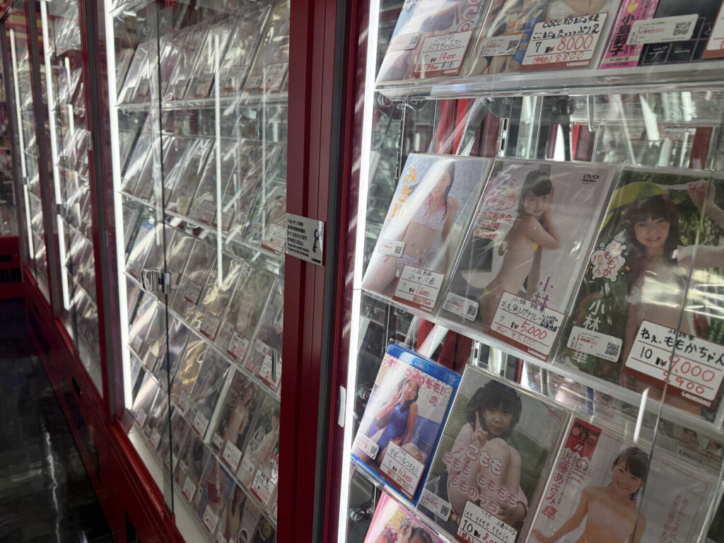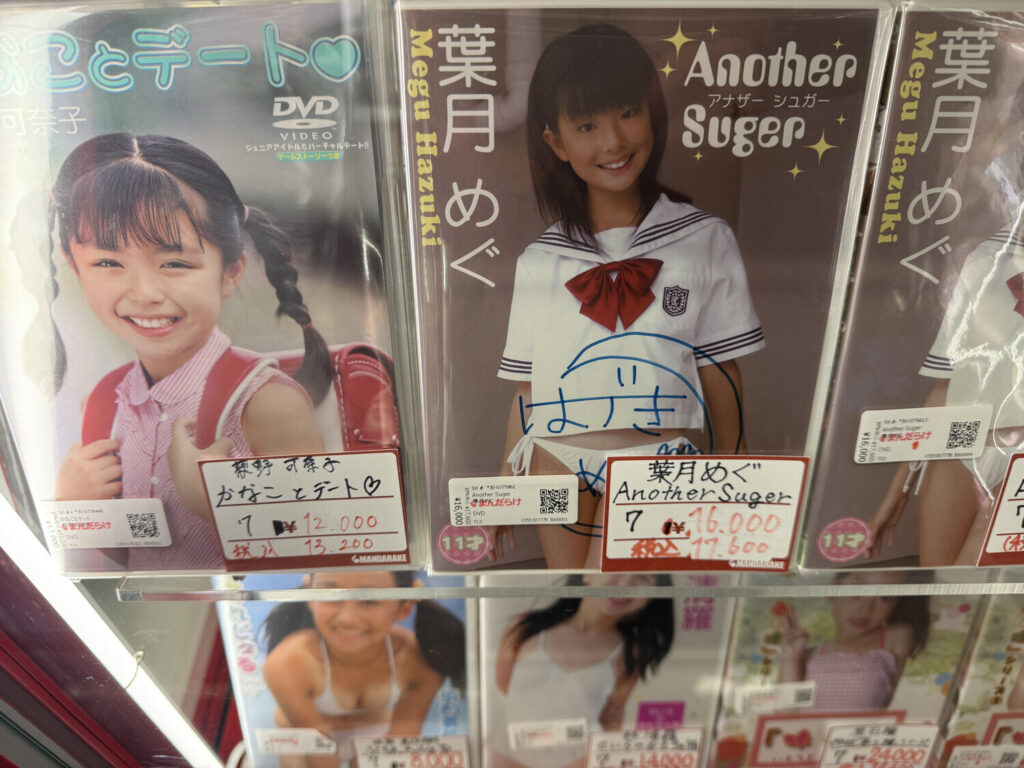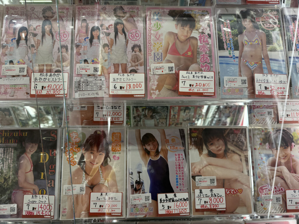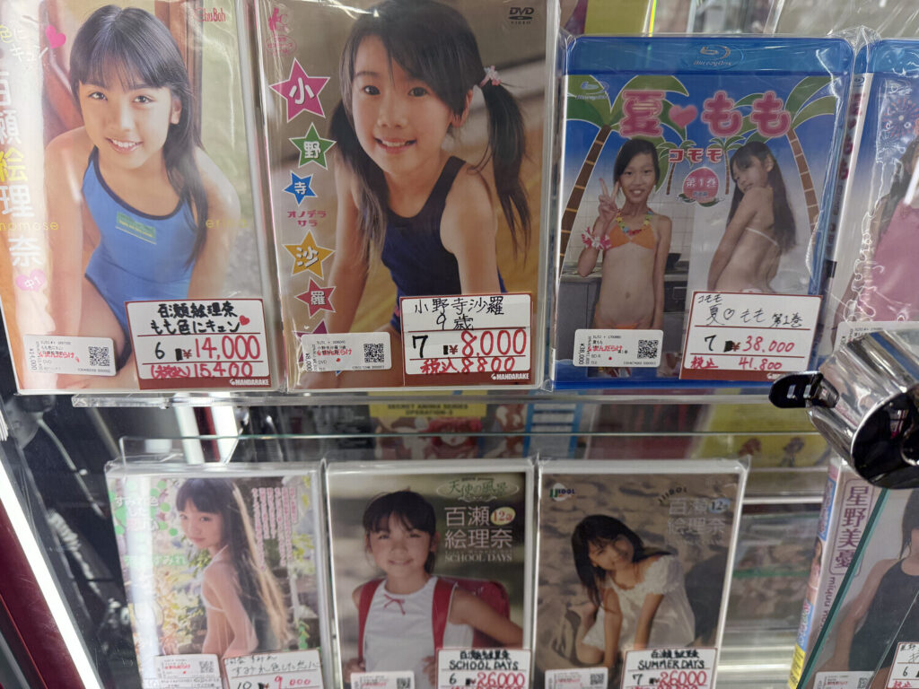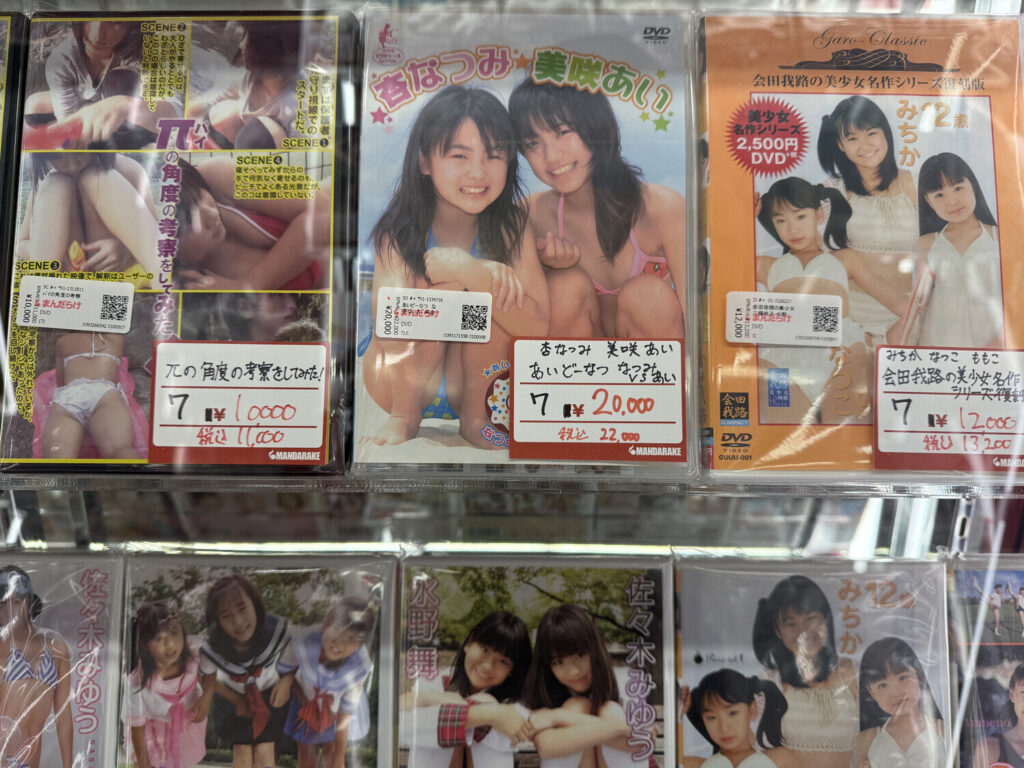 Las publicaciones prohibidas resultaron ser DVDs y Blu-rays de junior idols. Había algunos discos de adultos también, pero la mayoría parecía ser de modelos jóvenes (U15). Por supuesto todo era 着エロ (chaku ero; erótica sin desnudos) como siempre es el caso con modelos menores de edad.