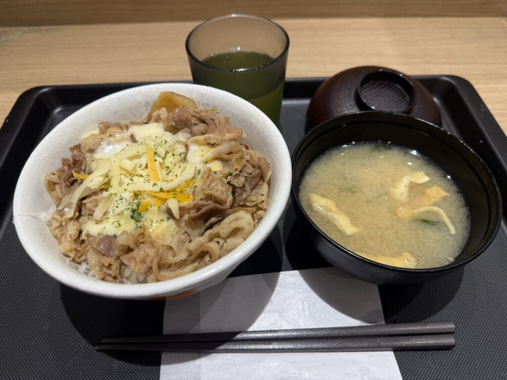 A las 15:18 pedí mi almuerzo en Matsuya, y dos minutos más tarde ya lo tenía frente a mí en la mesa. Si recuerdas, Matsuya es una cadena de comida rápida japonesa especializada en gyūdon (un bol de arroz con carne). Me pedí gyūdon con queso (¥660; ~3,6€).