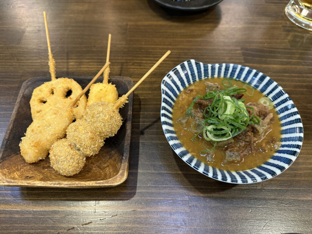 En Shinsekai la mayoría de los restoranes son de 串カツ (kushikatsu; brochetas japonesas). Decidimos ir a uno de ellos llamado 大衆屋台 五右衛門 (Taishu Yatai Goemon). Nos pedimos dos brochetas (yo una de queso y una de pollo) y un plato de どて焼き (doteyaki) cada uno. Pagamos más o menos ¥1200 cada uno (6,5€).