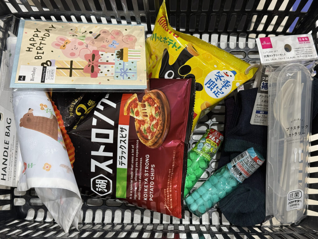 No hay forma de que pudiese conseguir todo esto en una misma tienda, ¿verdad? Incorrecto. No solo conseguí todo en Daiso, sino que todo me costó 100 yenes cada cosa. Compré cuatro snacks, dos pares de calcetines, un cortauñas, un set de palillos, cuchara y tenedor, una tarjeta de cumpleaños y unas bolsas de regalo. Diez ítems en total, con lo cual todo me costó 1000 yenes más impuestos (¥1092; 6€).
